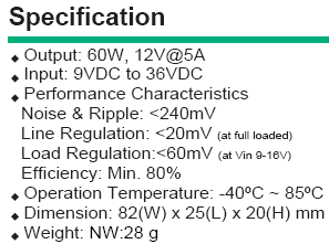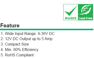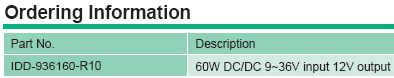 This is a high performance buck-boost switching regulator power module. The constant frequency current mode architecture allows a phaselockable frequency of up to 400kHz. With a wide 9V to 36V input and 12V output and seamless transfers between operating modes, the IDD-936160 is ideal for embedded system which space is limited.